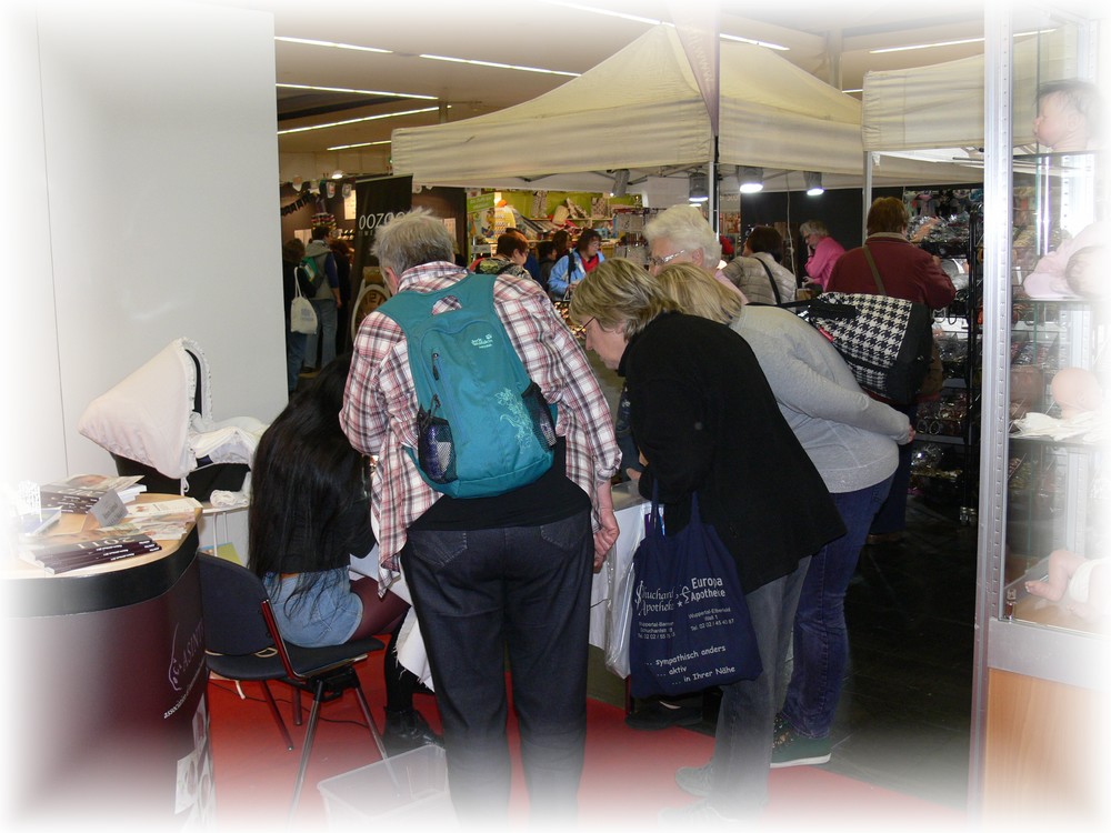 Auf dem 16m² großen Stand in Halle 7 - also bewusst außerhalb des auf das Wochenende beschränkten Puppen- und Bärenmarktes in Halle 3B - waren meine Rooting-Vorführungen sowie die wenigen Beispiel-Puppen ein echter Publikumsmagnet. Tausende interessierter Besucherinnen (Frauenanteil rund 99%) auf dem Stand und hunderte von Informationsgesprächen mit Szenefremden waren zwar super anstrengend, jedoch auch wahnsinnig motivierend und zielführend!
