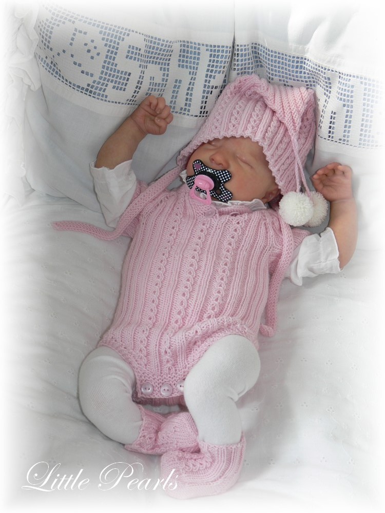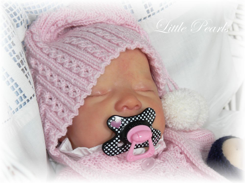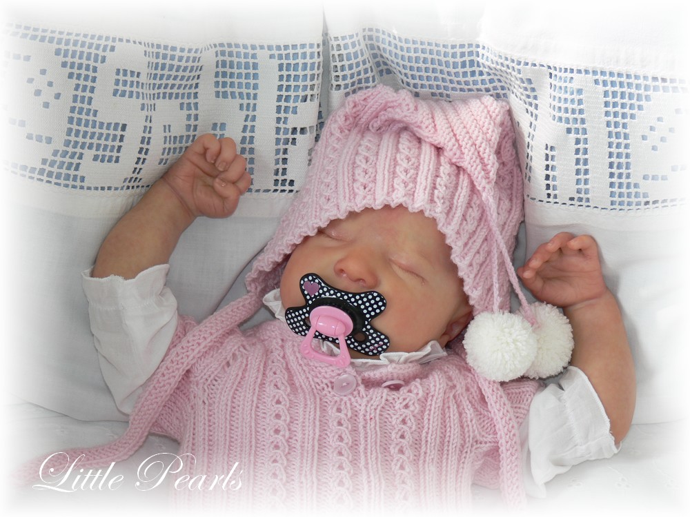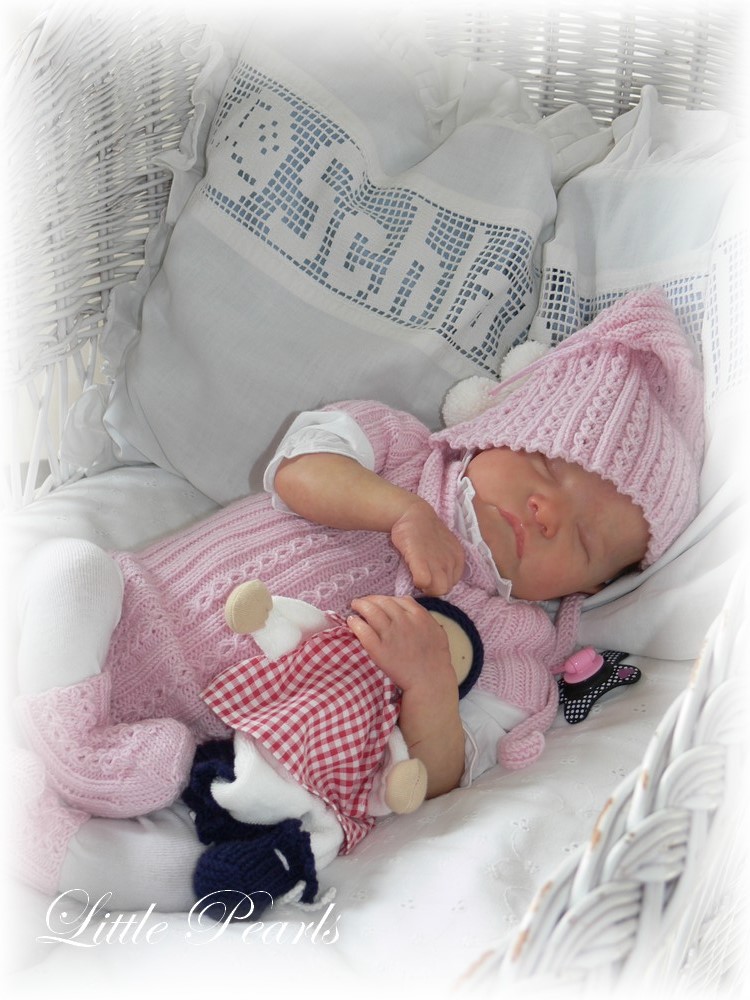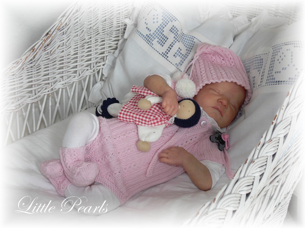 Dieses niedliche, noch aus der auf 1.995 limitierten Erstauflage gestaltete Reborn Doll Kit (# 1.632) - im Original von Bonnie Brown als Levi modelliert - hat lange Arme und Beine (1/1). Es eignet sich somit ganz hervorragend auch für die kurze Sommermode für das kleine Perlchen.