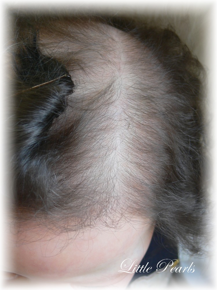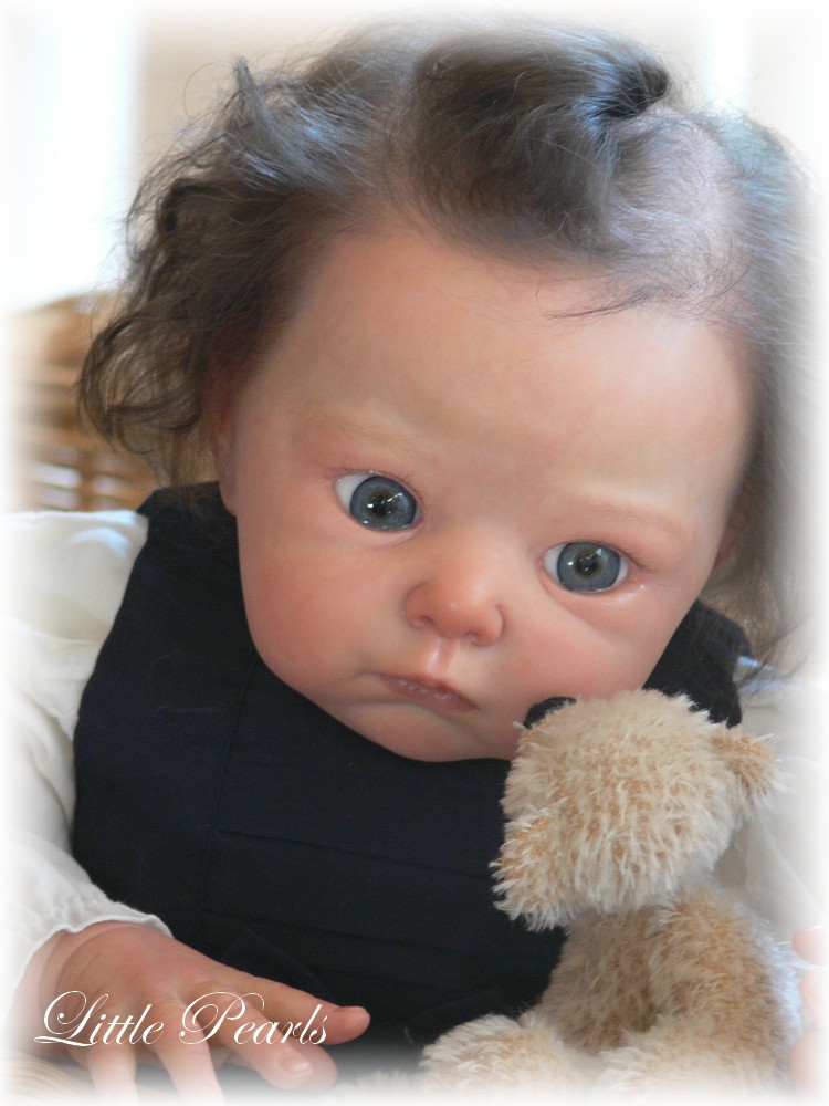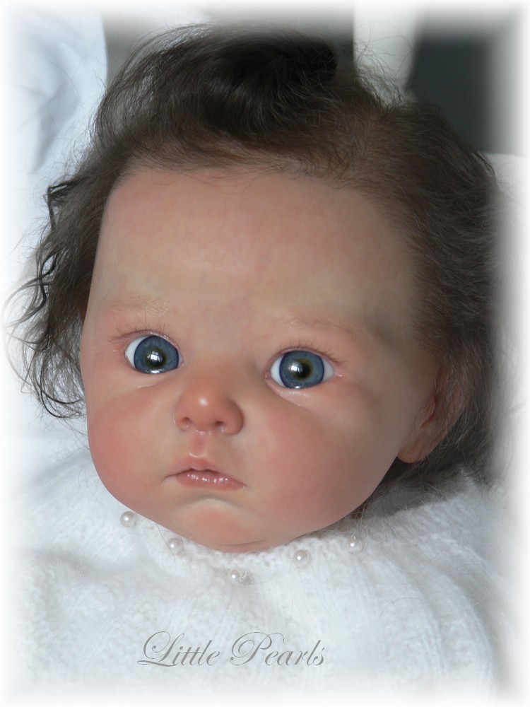 Alleine für die Gestaltung der Kopfbehaarung habe ich rund 200 Arbeitsstunden investiert. Das verwendete Premium-Mohair kommt echtem und altersgerechten Menschenhaar extrem nahe und lässt zudem auch eine Reihe typischer Babyfrisuren zu.